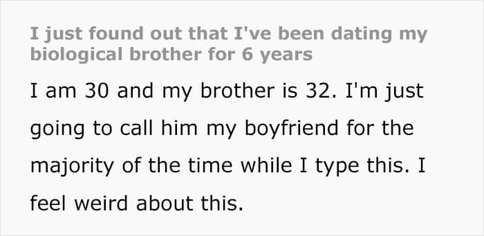 I just found out that I’ve been dating my biological brother for 6 years” – this woman turned to Reddit’s r/offmychest community to reveal that she and her long-term partner are actually biological siblings. The startling and life-changing tale has managed to receive only 239 upvotes and 128 comments despite being uploaded a couple of months ago.