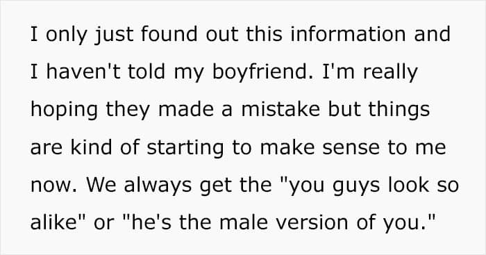 Once she discovered this information, she didn’t tell her boyfriend. She hoped that the DNA company had made a mistake – however, she did confess that things began to make sense. The pair would always receive those “You guys look so alike” or “He’s the male version of you” remarks. They would usually laugh it off, but she spent the whole morning looking at their pictures and realized that they indeed do look like each other.