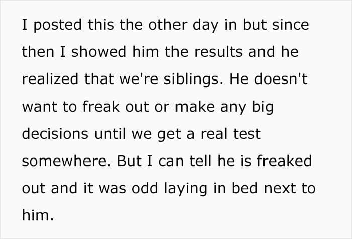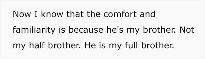 The couple’s relationship was great – they understood each other quickly and they were both really attracted to each other. The OP revealed that she’s never met a person to whom she felt such an immediate attraction and familiarity. However, she has a couple of guesses as to why everything felt so easy: the boyfriend with whom she shared a bed and did all the things that a normal couple would is actually her brother – not even her half-brother but her full brother.