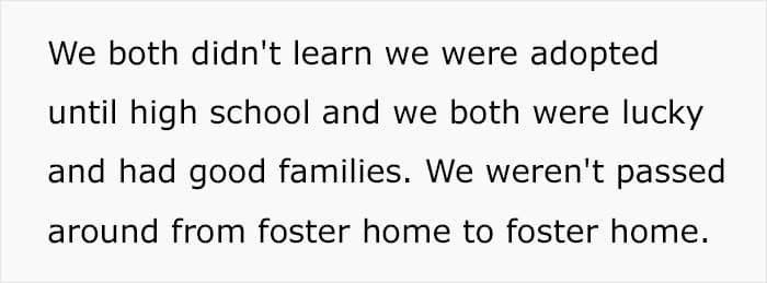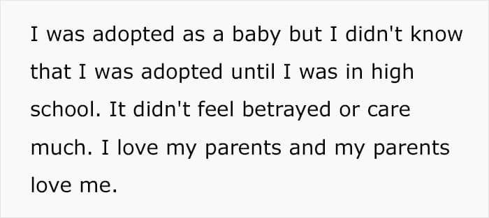 The woman began her post with a brief introduction: she’s 30 years old and her “brother” is 32. She was adopted as a baby – yet, she wasn’t aware of this until she was already in high school. The OP also added that she never felt betrayed, nor did she ever care because she has a great family.