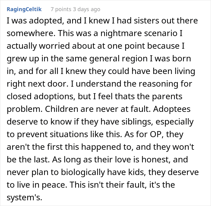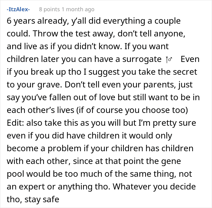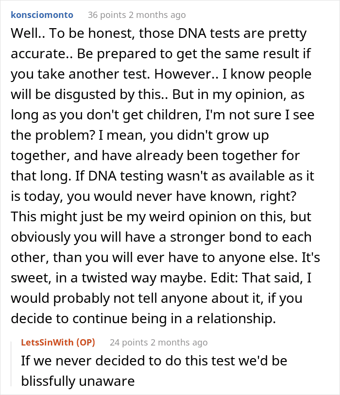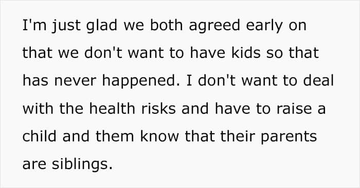 The one thing that the OP emphasizes is their agreement to remain childfree; she said she doesn’t want to deal with possible health complications and have to raise a kid with them knowing that their mommy and daddy are siblings.