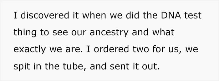 The woman discovered this rather horrifying info when they did a DNA test to see their ancestry and “what exactly they are.” She ordered two, and they both spit in the provided tube and sent the samples out.