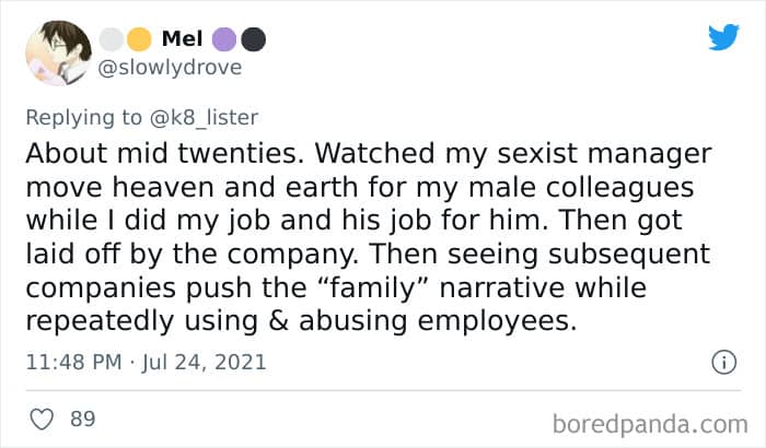 Kate’s thread was a massive success on Twitter. Her questions got a whopping 351.6k likes (that’s over a third of a million!) and was retweeted over 54k times. People opened up the difficulties they faced at work and exactly when they realized that being a dedicated worker who goes out of their way to do more than everyone simply isn’t enough. Not everyone is recognized for working hard. Though I personally still believe that discipline and working hard are the core reasons for success. Is that naive of me? Realistic? That’s for you to decide, dear Pandas.