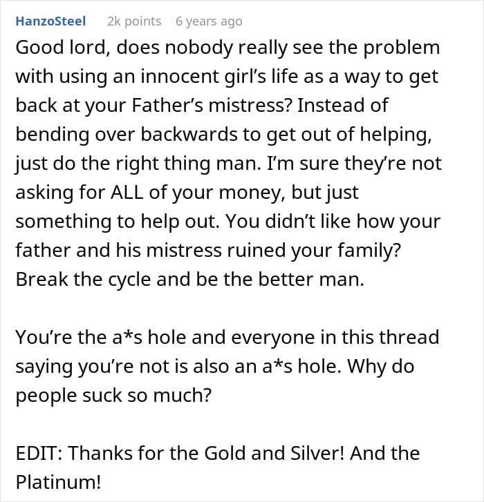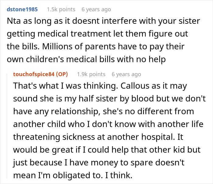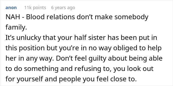 Netizens acknowledged the OP’s difficult position, noting the situation’s complexity without placing blame on her. They agreed that while it’s unfortunate for the half-sister, she was under no obligation to intervene financially.