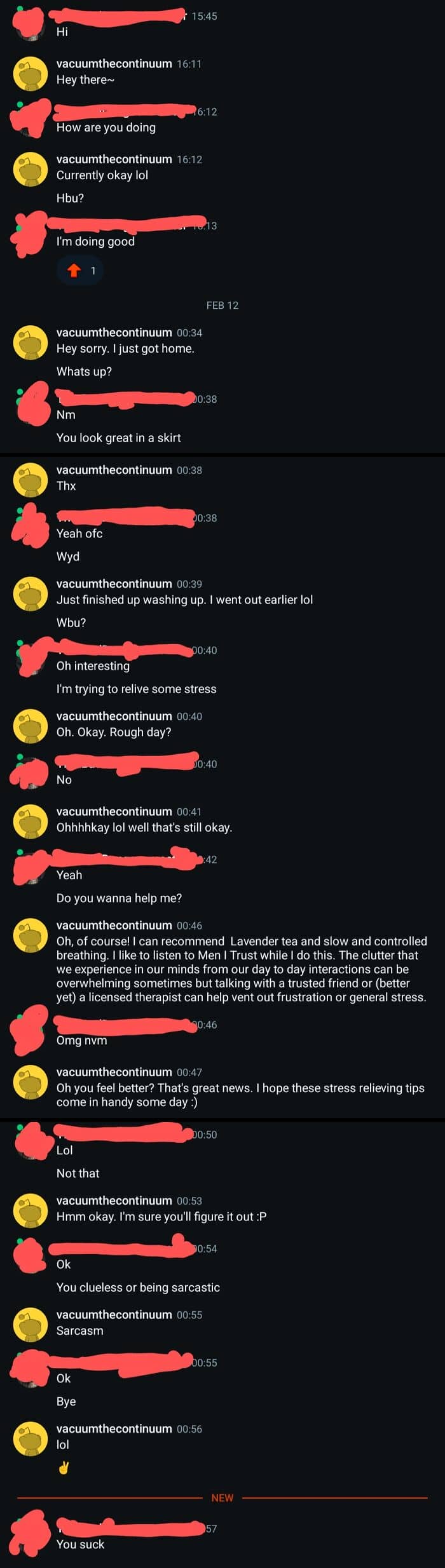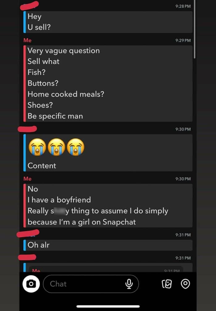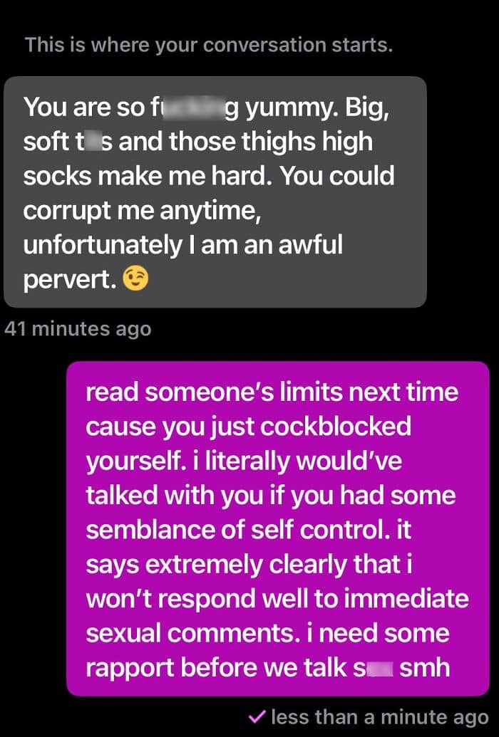 He ended this by saying. “Yep, super judge mental. Thanks d**k head.” And blocking me. For context, he was 39. I’m 20.