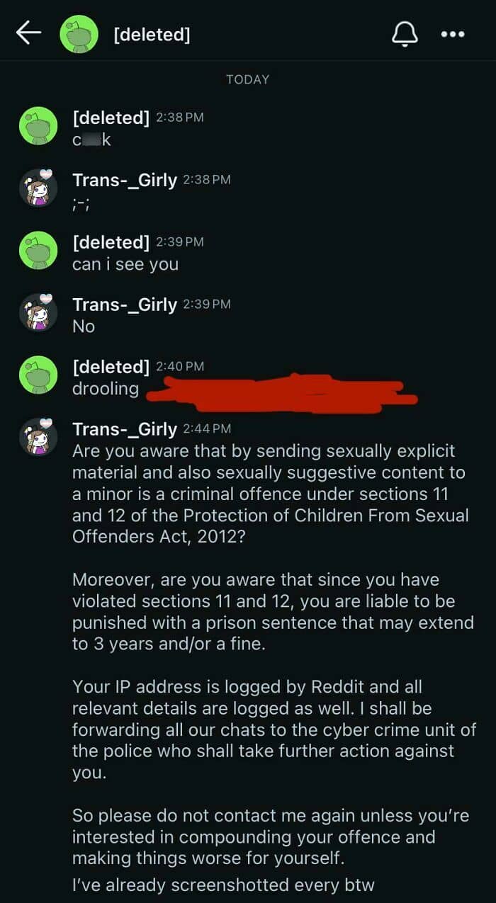 The blacked out part is some nsfw link he sent me. Now obviously I don’t care enough to actually do anything but it satisfies me so much that I ruined his day and hopefully his week and put some fear in him that everyone would know what kind of a person he is 🤌😇
