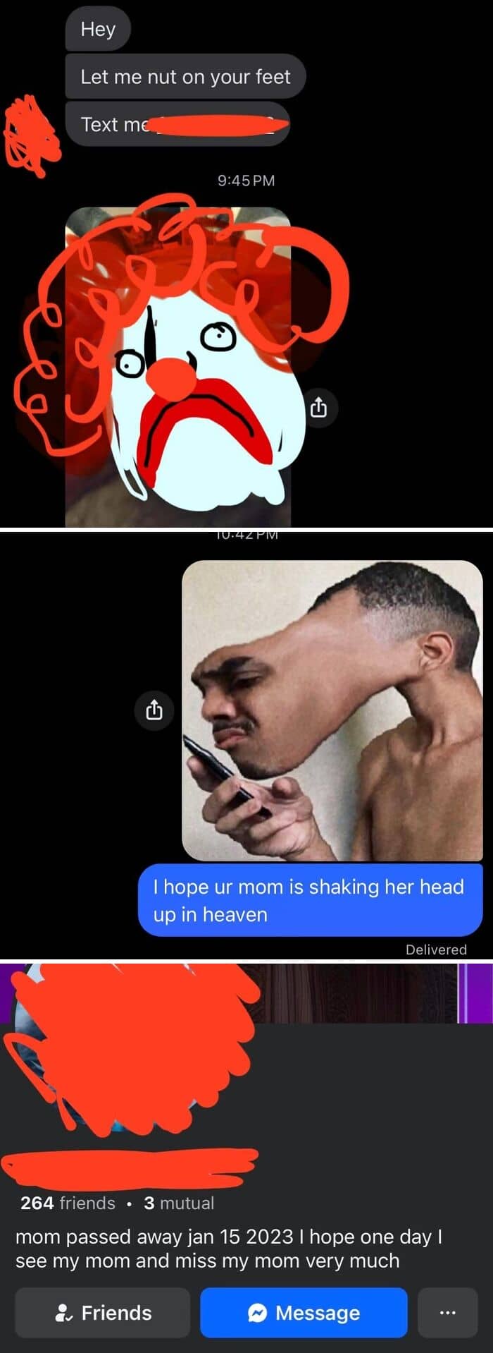 Some context: this guy had pm’ed her a while ago and been trying to convince her to sleep with him (they had never met) and when she said no he went on a long rant about his single mom and grandad raising him so he doesn’t know how to talk to women.
