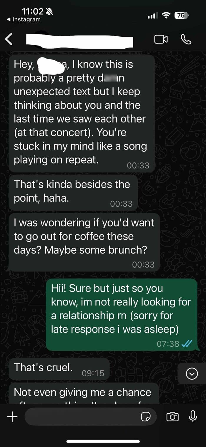 This guy that messaged me (I censored his name and picture because apparently I had to do so) reacted to the first photo I had on my profile, which says that I’m taken (censored also).