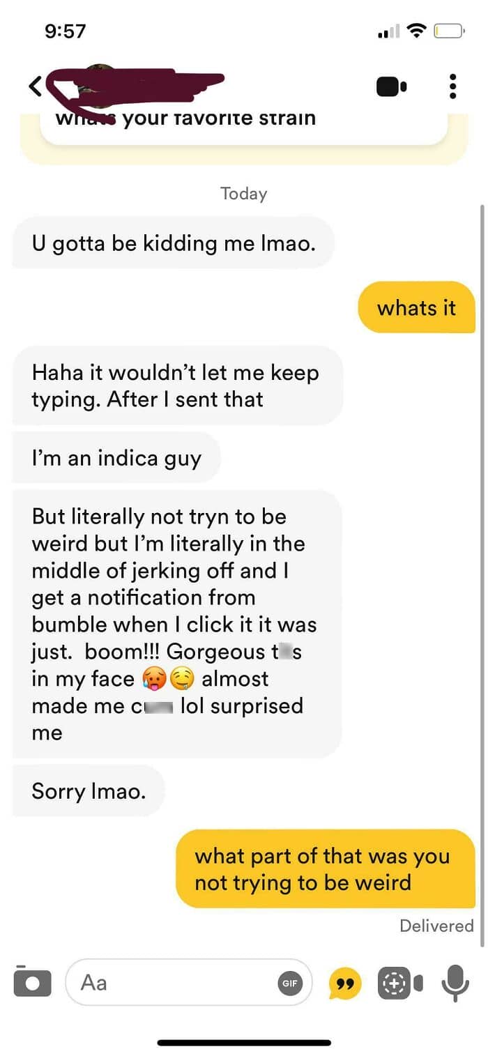 This guy is twice my age at least, and our only prior communication is from him occasionally c*****g my grass. This isn’t the first time he’s hinted at this before, but I’m used to men being this weird, so I usually just ignore it.