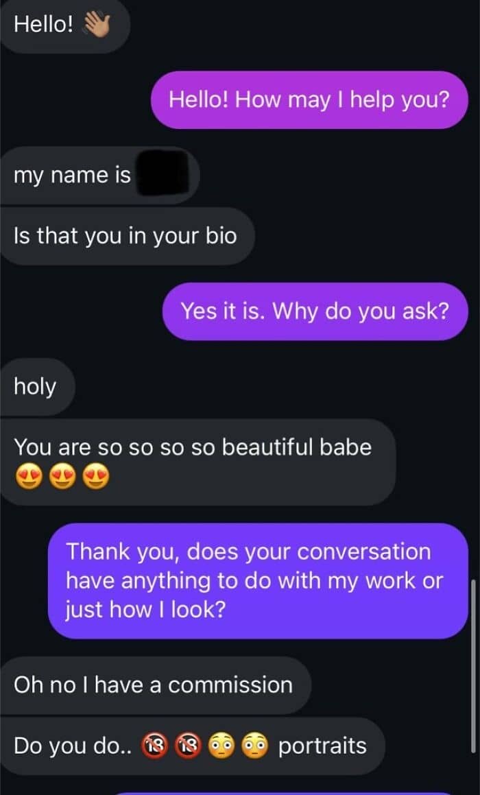 For context,I(Today 24M,Openly Bi) don’t celebrate my birthday. Dad wasn’t present,mom was violent,and I lost contact with my sisters,ended up being abandoned in the hospital on my birthday when I was younger,having had to live in the streets for over a year since my country doesn’t take male child abuse seriously, especially when the agressor is a woman. Lifted myself back up,but obviously,October 3rd makes me feel like a scared kid yet again. Last year I tried making a party for the first time,but everyone of the friends I invited ditched last minute and it felt like shit. I told my gf I would never try it again because I felt so small and insecure. Fast forward to now,today’s my bday and I’m hit with this. For context,I’m an artist,and so is the person on the post,which is how we “met” online since we never spoke in person and have about a total of like 10 messages prior to this I think. When they said they’d give me a gift,I thought it would be a drawing because I already did that to others,and others have done to me. Nope. Just blatant, unrequested flirting. And now I just feel worse and even less like my feelings matter regarding this day.