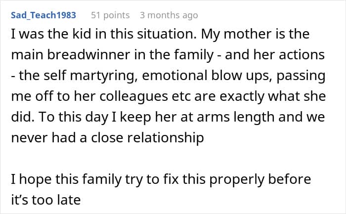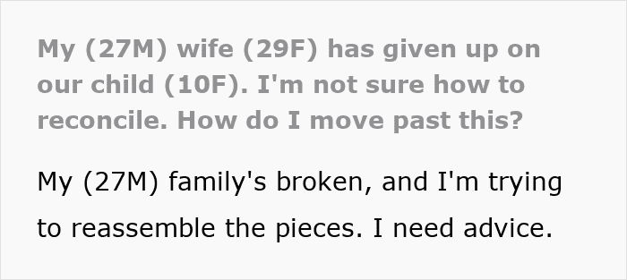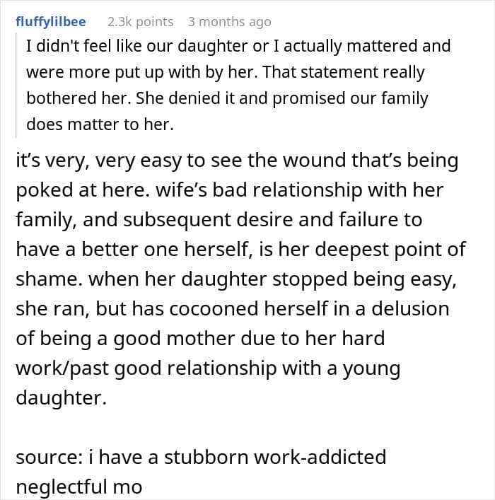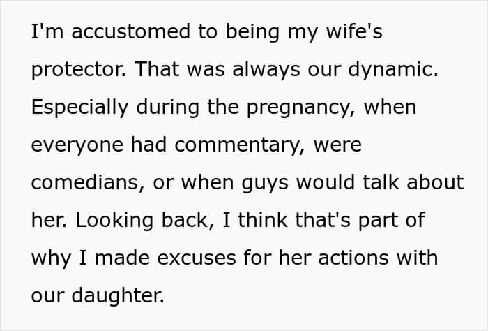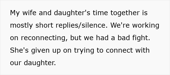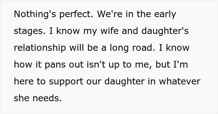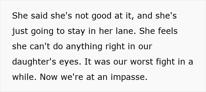 OP’s wife interpreted this distance as her daughter not liking her and told him that it was tough to come home to a kid who disrespected her. Well, the poster tried to explain that it’s not the child’s fault, as the woman needs to step up and start getting involved in her life. Sadly, this just escalated their fight to the next level, and things got pretty tense between the two.