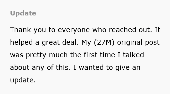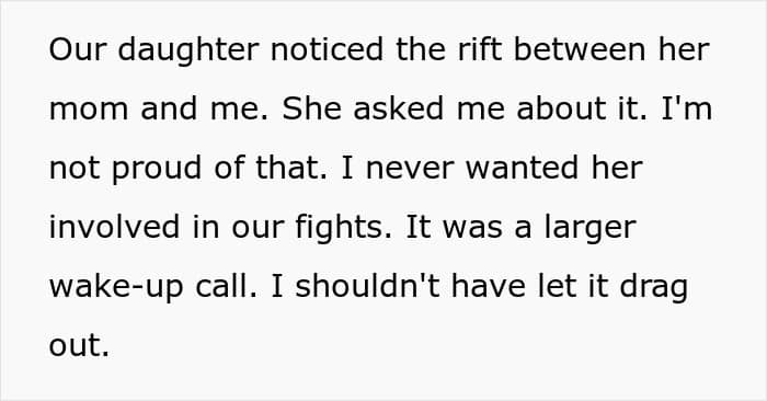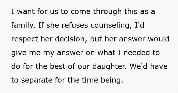 The poster updated that their daughter noticed the rift in the couple, which hurt him so much that he decided to work things out. The horrific part is that he realized that his wife’s behavior might be because of her toxic parents, who were very violent towards her during her childhood. “Using the belt” was their parenting style, and now she never even talks with them.