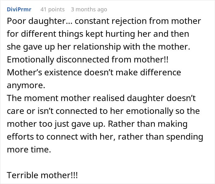The daughter had also distanced herself from her mother, as the woman showed no interest in what she liked and never made time for her