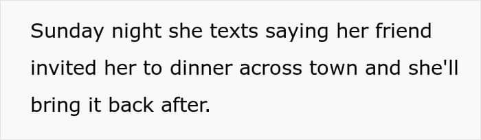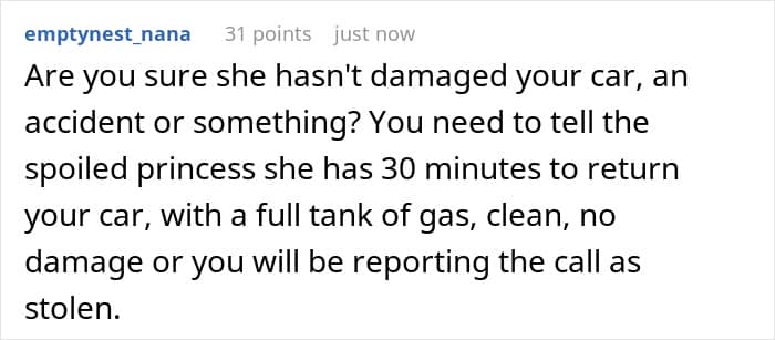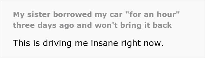 By the next day, the car was still missing in action, the OP’s sister promised to drop the car off until she texted saying she forgot to bring it, was tired, and would return it the very next day. At this point, the OP needed her car as she had a dentist appointment and groceries to get. Still, nothing from her sister who then said she was being “pushy” when the OP insisted she needed her car.