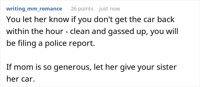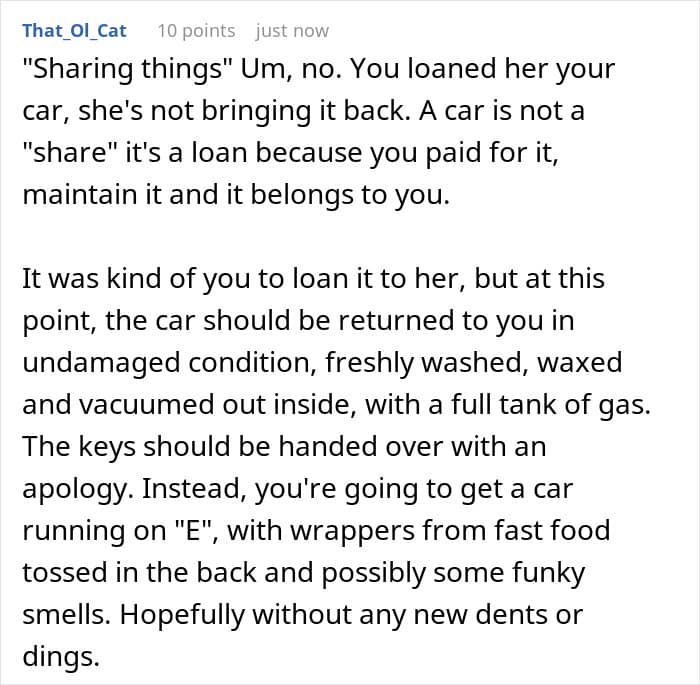 Meet today’s Original Poster (OP) whose simple act of kindness which was lending her sister her car for an hour ended up turning into three days of not getting it back. What followed was her mother insisting that “siblings share” things and the OP feeling like a jerk.