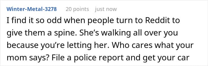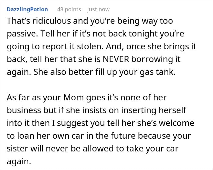Fed up, she got a ride from her mom to confront her sister only to find her sister’s own car sitting in the parking lot, perfectly fine. Turns out, it had been out of the shop for days, but she just didn’t want to pay the repair bill yet. In the end, the OP got her car back on empty, and her mother accused her of “embarrassing” her sister.