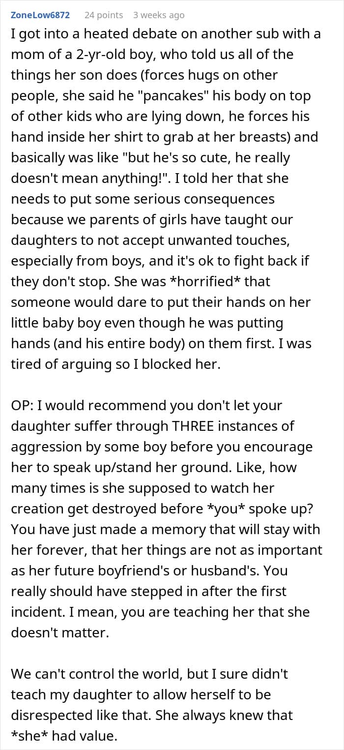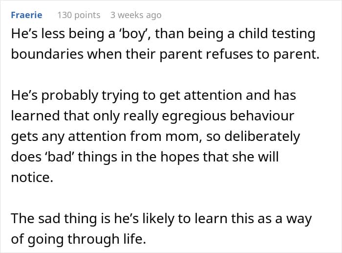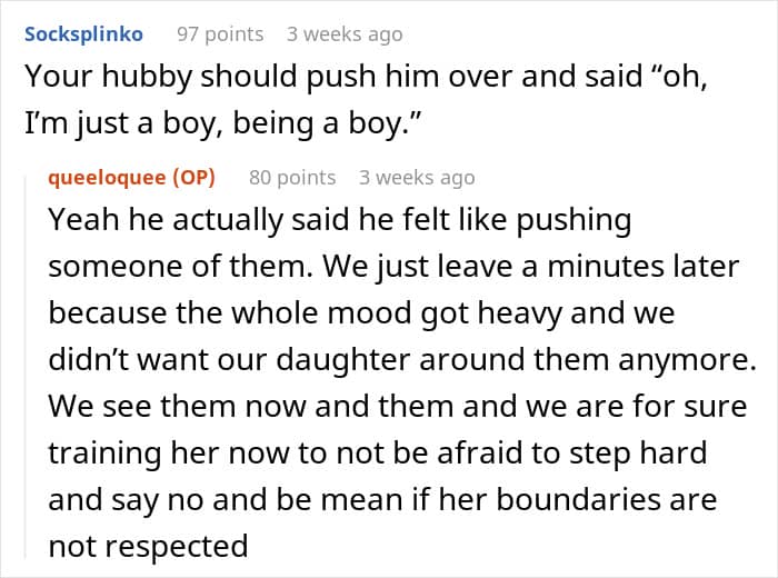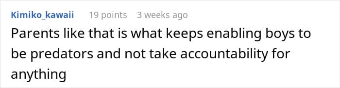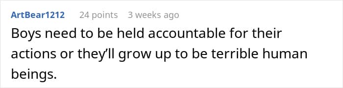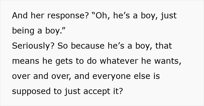 But she only responded with “Oh, he’s a boy, just being a boy.” This infuriated the OP – are we still using “boys will be boys” justification in the big 2025? Apparently, not everyone is aware of how harmful this phrase is.