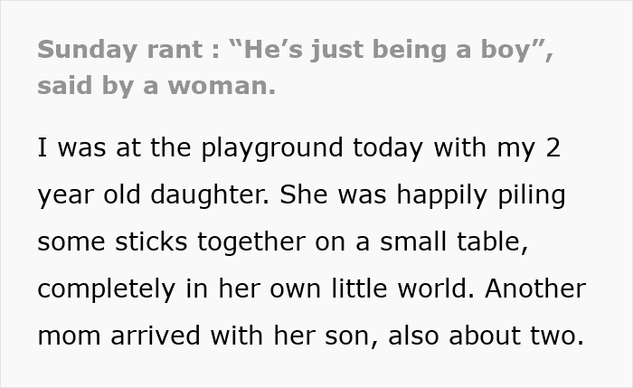 One day, the OP was spending time at the playground with her 2‑year‑old daughter. The girl was piling some sticks on a small table, just playing in her own little world. Then, suddenly, a boy with his mom shows up.