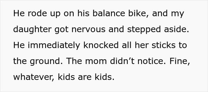 That wouldn’t have been a problem if not for the boy’s behavior. Immediately upon arrival, he knocked all the girls’ sticks to the ground, and his mom didn’t pay attention to it. The original poster was willing to let this go; maybe it was just one misstep of his.