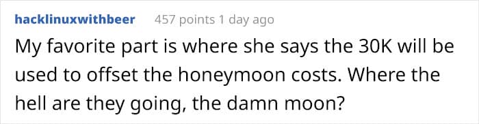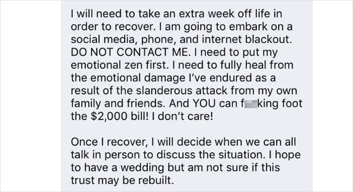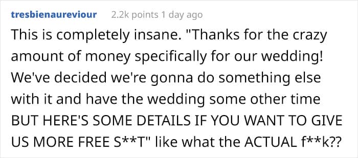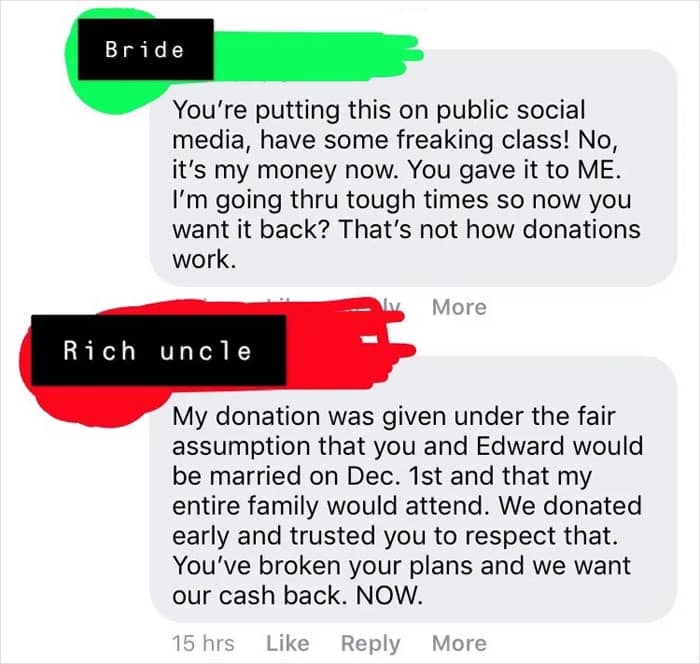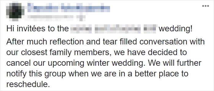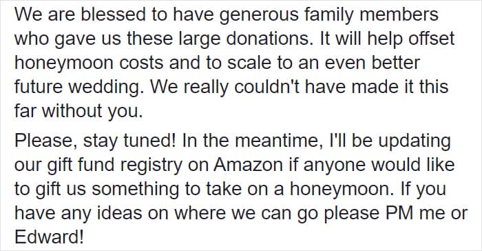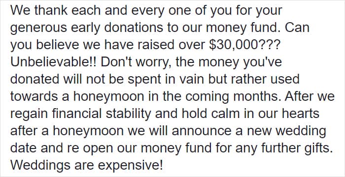 Recently, Reddit user joyeuxanniversaire1 uploaded a screenshot of a Facebook post, and it got over 87K upvotes on the platform. But not because people like it, on the contrary, it’s a perfect example of just how toxic choosing beggars are. Addressing the invitees of her wedding, this bride appreciated the $30,000 they donated for the event. And then canceled it.