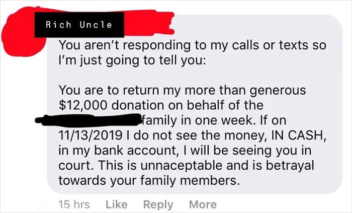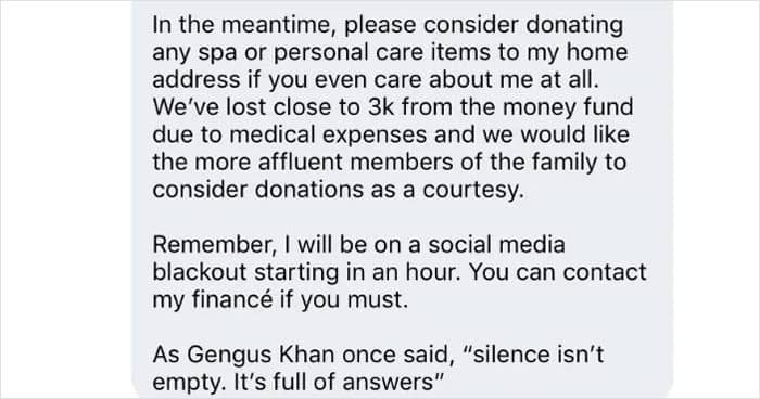 However, greed’s appetite grows while eating. After sharing the news, this woman asked for more donations. I don’t know if you can call it a spit in the face. More like taking a dump on everyone closest to you.