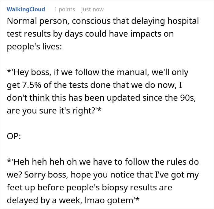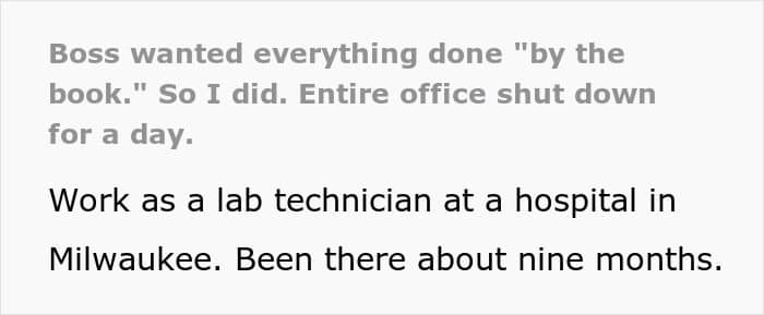 Cue frantic calls to leadership, compliance, and probably Derek’s therapist. The entire department had to shut down non-urgent testing until a new protocol was rushed through. Apparently, Derek hasn’t made eye contact with OP since, but at least one coworker honored the master of malicious compliance with a free coffee.