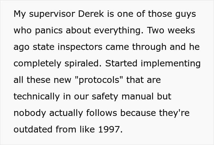 The original poster (OP), a hospital lab tech in Milwaukee, shared how their supervisor, “Derek”, is the human embodiment of a caffeine overload. When state inspectors visited, he panicked and suddenly decided the entire department had to start following every dusty, outdated rule from their 1997 safety manual to the letter.