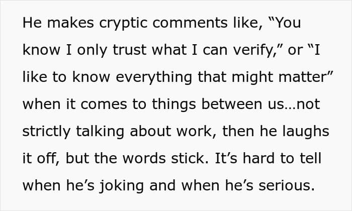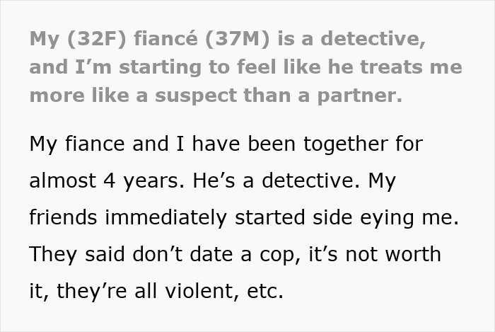 The woman realized that her fiancé was treating her like a suspect with his constant interrogations, background checks, and lack of trust