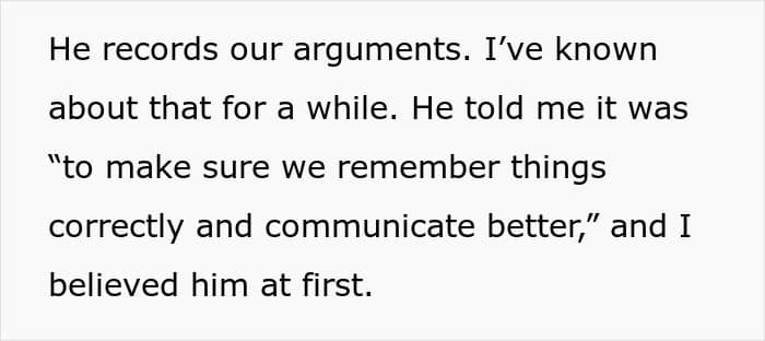 All these things didn’t become apparent to the woman until much later, when she realized that her fiancé was behaving in weird ways. One of the most shocking instances was when she found out that he had been recording their arguments for a year in a folder marked with specific dates and times.