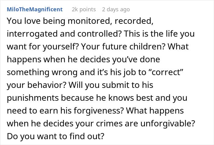 The poster couldn’t take her fiancé’s bizarre behavior anymore, and she felt that he needed to get therapy to deal with his lack of trust. Netizens also pointed out that he was very controlling and that the woman needed to set boundaries with him or end the relationship if she always had to give in to his demands.