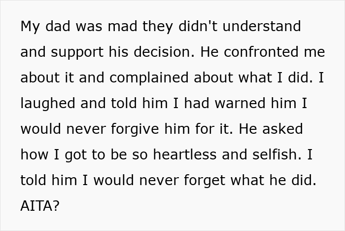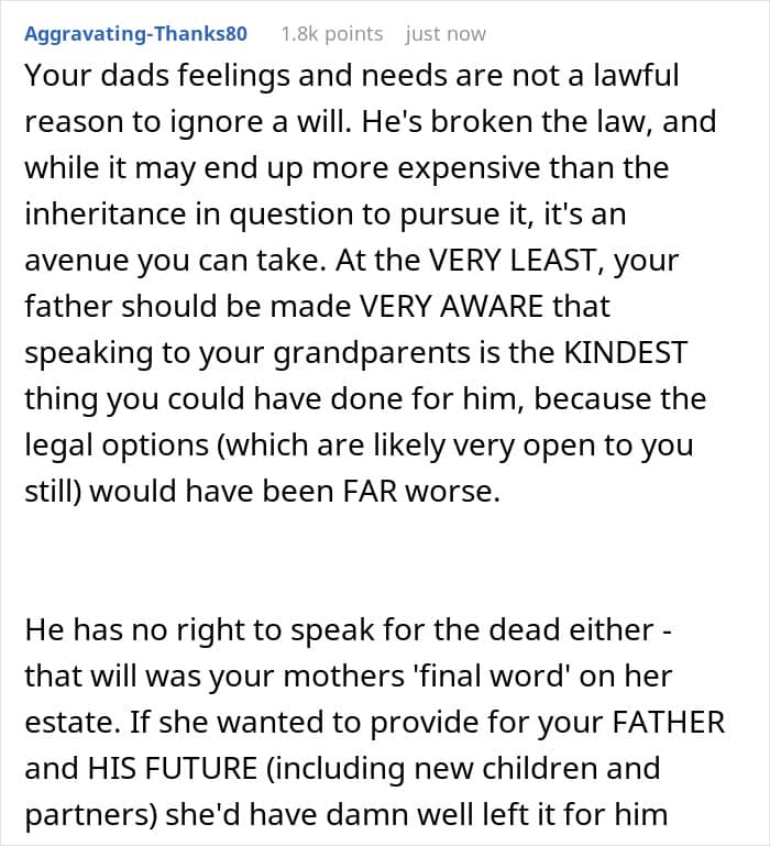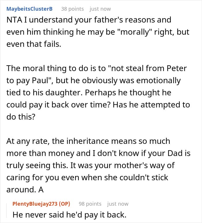 Just ask Reddit user PlentyBluejay273 — he knows all about it. When the teenager discovered that his father secretly used the inheritance his late mother left him to pay for his half-sister’s medical treatment, he realized that sometimes, even family is something you have to stand up to.