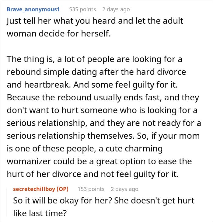 Reflecting on the past with their family, adult children may wonder: “Was it all smoke and mirrors? Were they ever really happy?”, Hughes says. Some of her clients have ended relationships and engagements because of their parents’ divorce, or questioned their identity and self-esteem, she adds. So it very well might be that our Redditor’s confusion and inability to react to the man hitting on his mom is somehow connected to the unresolved emotions following his parents’ divorce.