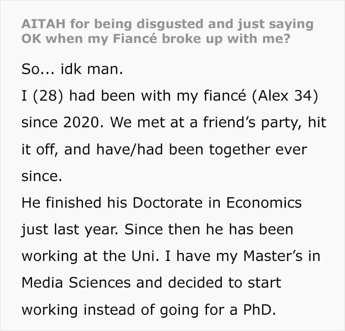 The poster and her fiancé, Alex, had been together for four years; he got his Doctorate and worked at a university while she skipped her PhD and began working immediately