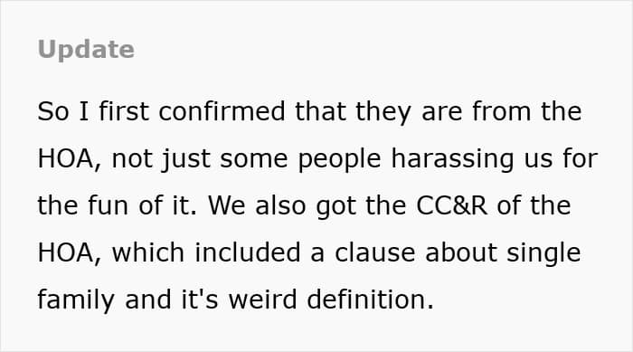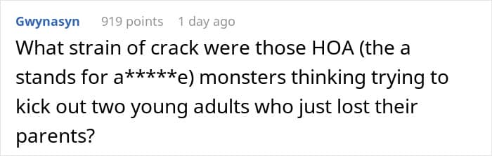 It stated that parents can live with kids or partners, but siblings couldn’t live together. Sounds absolutely ridiculous, right? The HOA showed up at their house 4 times to remind them that they had to comply and one of them had to leave. Probably feeling scared about the situation, they vented online, and netizens came up with numerous ideas to help them out.