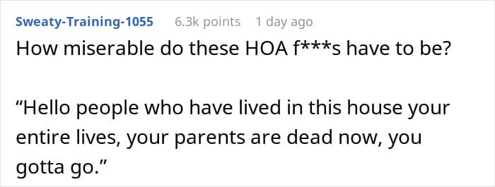 The siblings also found out that it was not just horrible to them, but to everyone, and constantly created trouble. No wonder that 57% of HOA residents don’t like having an HOA. The poster also informed us that new people are going to run for it. However, they were all contemplating whether to completely dissolve the HOA or not, since they just made things difficult for people.