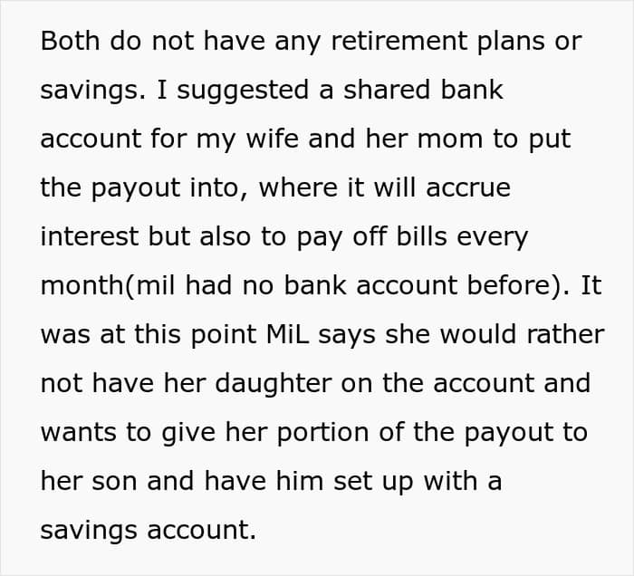 They didn’t even know that the man had life insurance, and it all went to the two, without OP’s wife getting anything. However, the problem is that neither of them has proper savings or a retirement plan. When OP suggested that his wife and her mom start a joint account, the older lady rejected this suggestion as she wanted her son to have her inheritance.