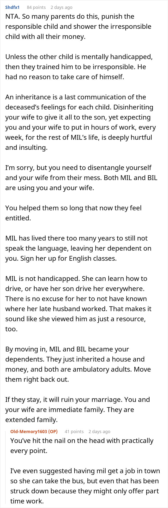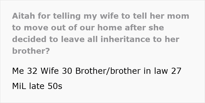 What really frustrates him is that his mother-in-law plans to leave all the inheritance to her son, so the poster suggested that they move out