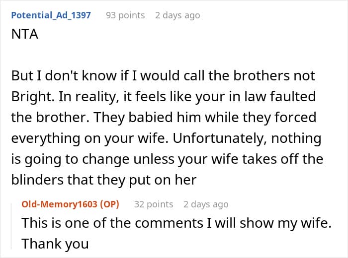 After his father-in-law passed away, the poster housed and took care of his mother-in-law and brother-in-law, as they were dependent on the man for everything