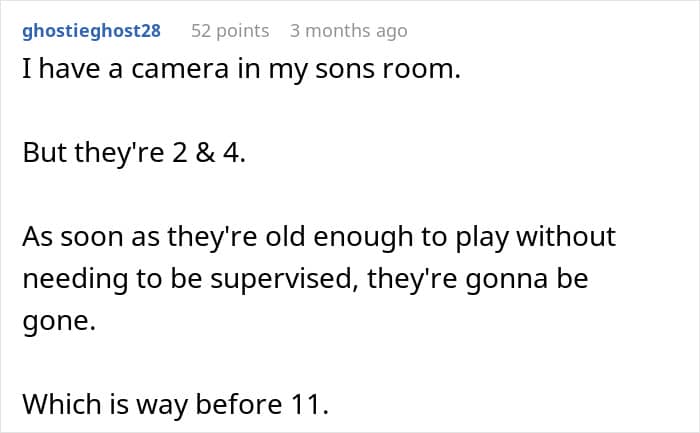 “I’m sure there are situations where a camera might be warranted – a medical condition, sleepwalking, etc. – but children, especially as they grow older, deserve a level of privacy in their personal spaces,” Amy shared.
