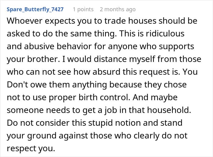 Entitlement is sadly common enough that most people have encountered a truly delusional person at least once, but it’s rare to see it in an entire family unit. Because the brother’s demand is truly unhinged, as OP is in no way, shape, or form required to just let a whole family take over his hard-earned house because it’s more comfortable for them.