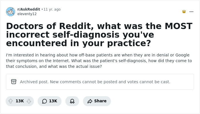 Someone once asked, “What was the MOST incorrect self-diagnosis you’ve encountered in your practice?” and judging by the answers, the real doctors out there have seen it all… From a patient who was convinced they had a bee in their eye, to another who claimed they’d had 20 heart attacks.
