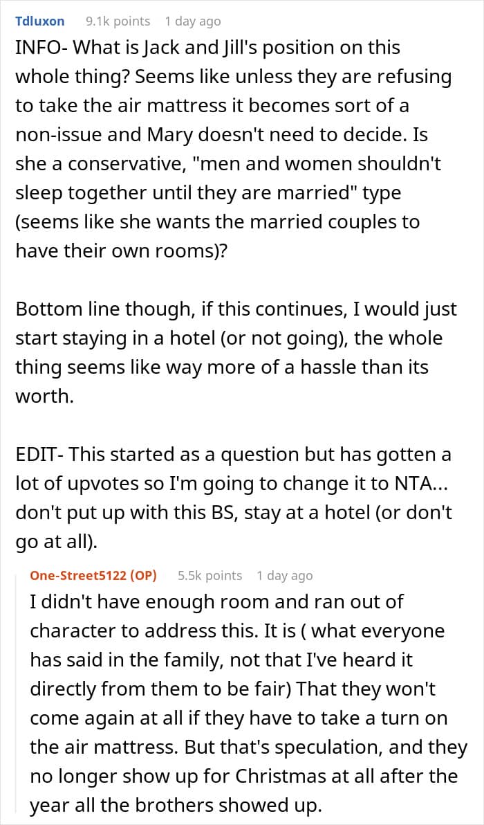 But apparently, it’s not surprising that Jack and Jill created an issue around the beds. “Everyone has had conflicts with Jack and Jill in the family,” One-Street5122 revealed. “We ended up having the air mattress in Luke and Millie’s room since they offered.”