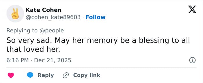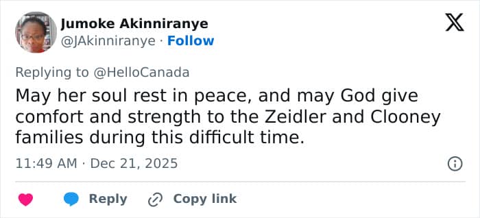 “May her soul rest in peace, and may God give comfort and strength to the Zeidler and Clooney families during this difficult time,” one user wrote