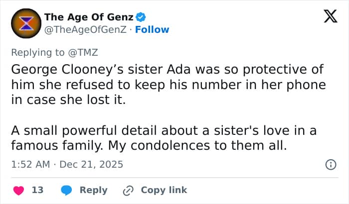 According to her obituary, Ada died at St. Elizabeth Healthcare in Edgewood, Kentucky. Her passing marks a personal loss for Clooney, who has often spoken about his close bond with his sister.