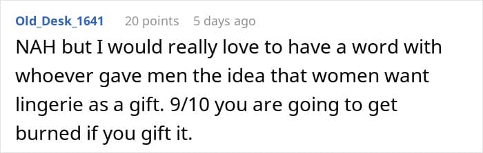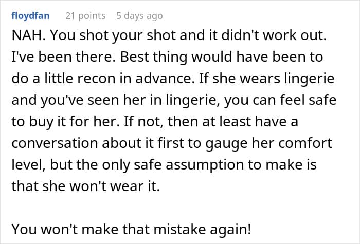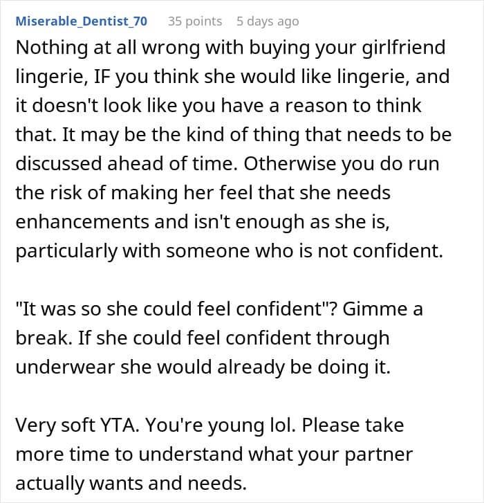 “He should have stopped to consider things that she finds special, treats that she gives herself and doubled up on that. If she’s feeling unconfident, getting her something that is just for her – should have been obvious,” she continued. “A lovely massage at her favorite spa, a special lunch at her favorite restaurant, or a nice planned getaway to a fun venue like an amusement park – would have had a much warmer reception, and likely to make her feel more confident, even in her plain underwear.”