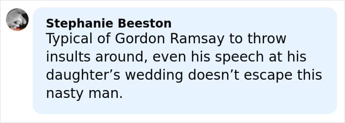 Celebrity chef Gordon Ramsay didn’t hold back at his daughter’s wedding to Olympian swimmer Adam Peaty, taking a jab at the latter’s parents amid an ongoing family feud.
