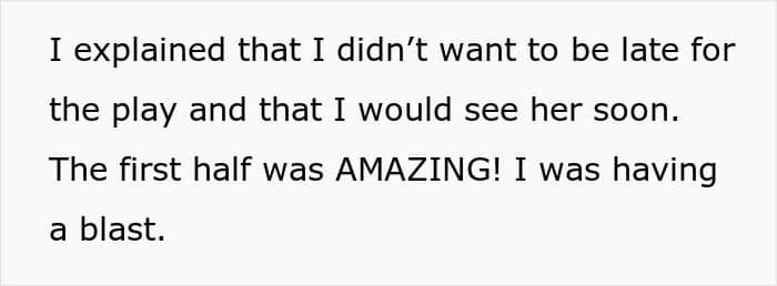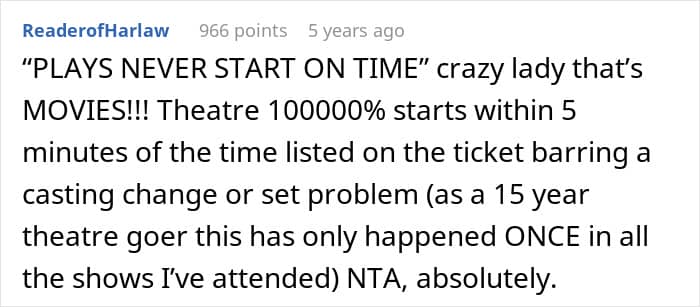 Lisa slowly made and ate a meal while scrolling on her phone, then disappeared into her room. The OP, her anxiety mounting, went to check on her, only to find her casually painting her nails. Lisa’s justification was a one-two punch of infuriating logic: “plays NEVER start on time,” and also, she needed to stop for gas and drop something off at her mom’s.