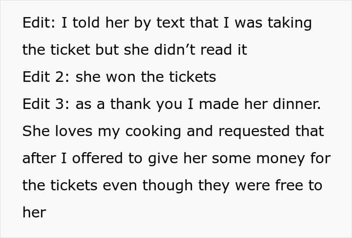 Faced with the certainty that she was about to miss the show of a lifetime, the narrator spotted the tickets on the fridge, made a split-second decision, and grabbed hers. She texted Lisa that she was leaving (a text that went unread) and made it to the theater with 20 minutes to spare, enjoying a glorious, Lisa-free first act.