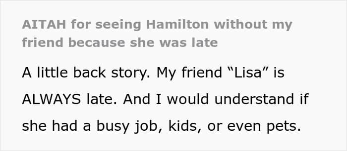A woman’s friend scored covetedHamiltontickets, but her notorious lateness posed a serious threat