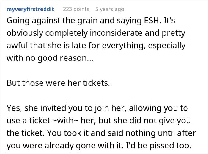 Lisa finally arrived just before the second half began, over an hour late, and was furious at being “left.” She argued that since they were “her tickets,” the narrator should have waited, a complaint that fell on deaf ears. The narrator, having enjoyed the first act and seeing her friend had missed it entirely due to her own actions, was left wondering if her desperate move to save the evening had made her a jerk.